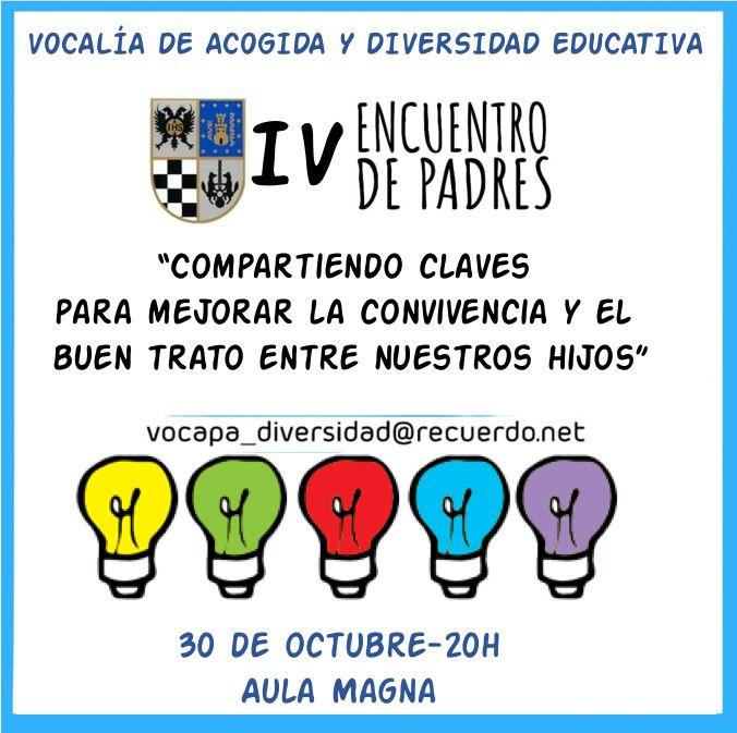 El pasado jueves 30 de octubre, bajo el lema “Compartiendo claves para mejorar la convivencia y el buen trato entre nuestros hijos” tuvo lugar el IV encuentro de padres organizado por la vocalía de acogida y diversidad educativa.